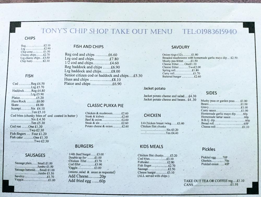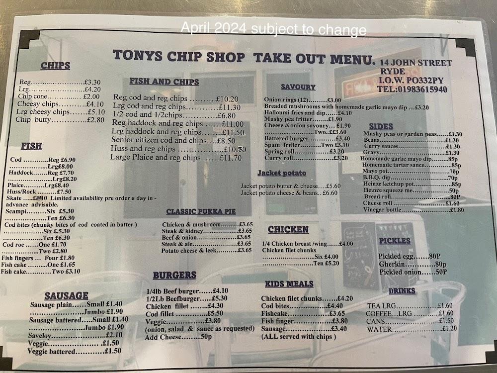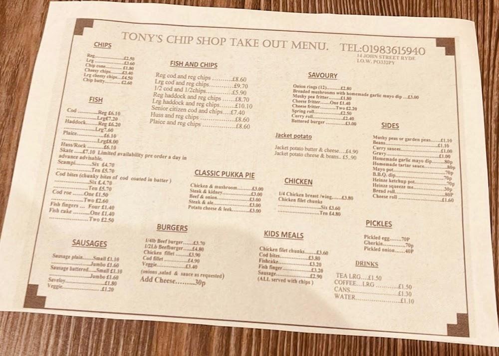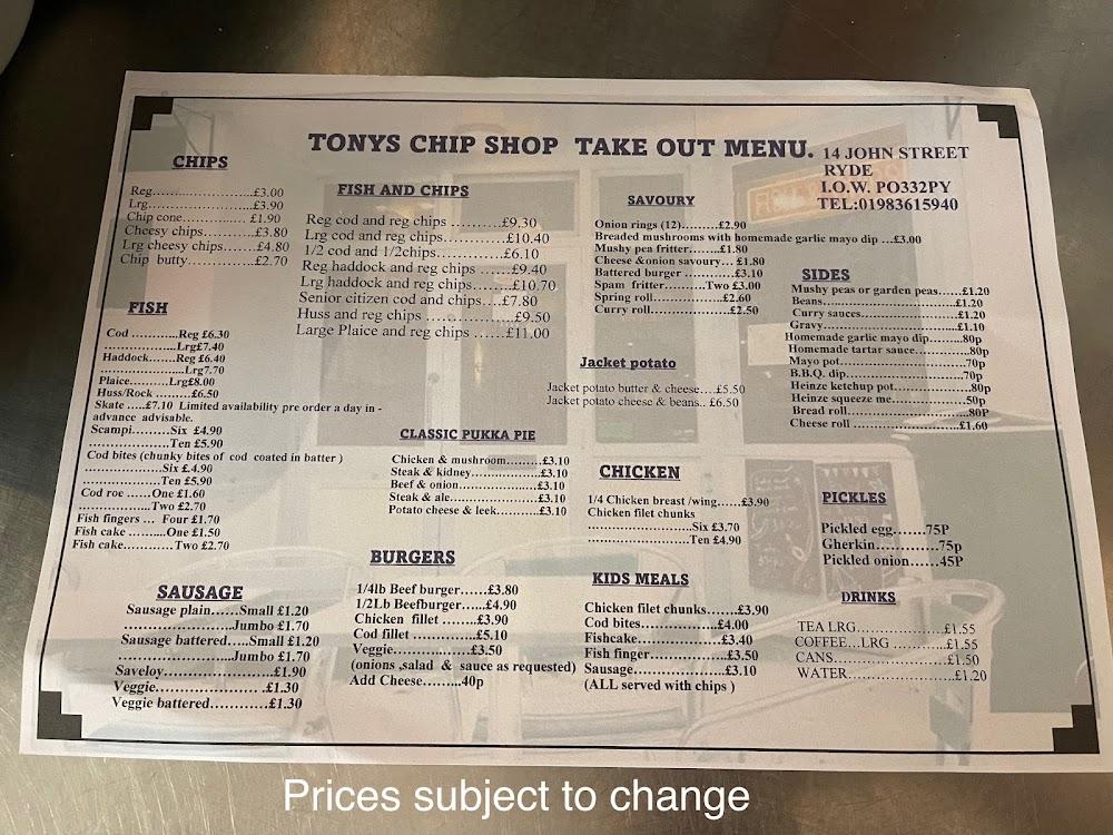 Located at 14 John St, Ryde PO33 2PY, Tony’s Fish & Chip Shop is a beloved local institution. It thrives on offering quality takeaway meals with a casual vibe. The eatery features outdoor seating for those who prefer dining al fresco and accommodates on-site services. Accessible to everyone, including wheelchair users, it has a designated parking area. Although modest in size, the shop feels welcoming, filled with the aroma of freshly fried fish that draws customers in instantly.